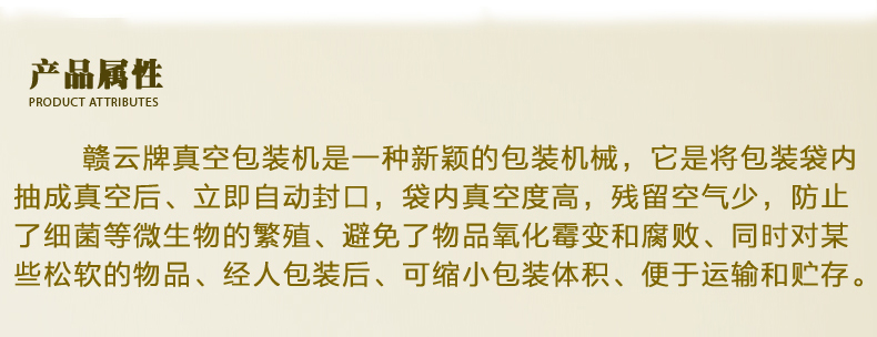 贛云牌真空包裝機是一種新穎的包裝機械,它是將包裝袋內(nèi)抽成真空后、立即自動封口,袋內(nèi)真空度高,殘留空氣少,防止了細菌等微生物的繁殖、避免了物品氧化霉變和腐敗、同時對某些松軟的物品、經(jīng)人包裝后、可縮小包裝體積、便于運輸和貯存。