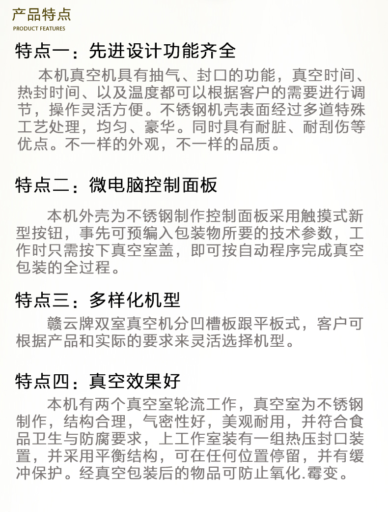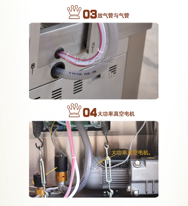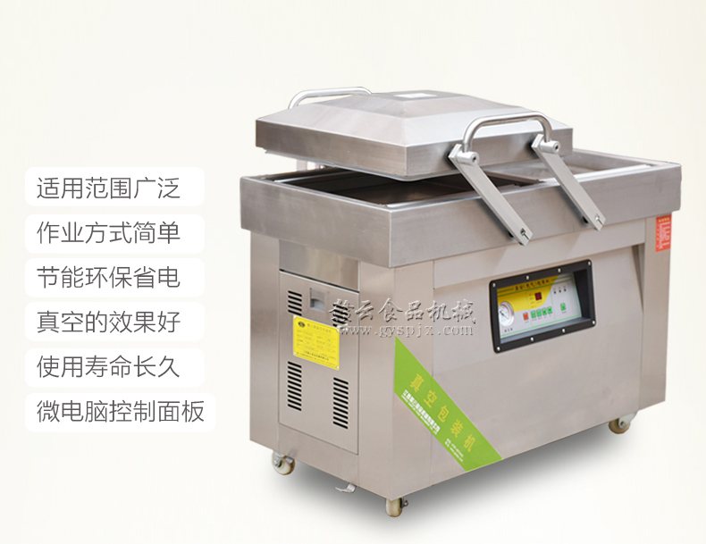 3、壓下真空蓋,面板上的抽氣指示燈亮,真空泵開始抽氣,機(jī)蓋即被自動吸引,抽真空時間可根據(jù)包裝要求調(diào)節(jié)適當(dāng)時間。