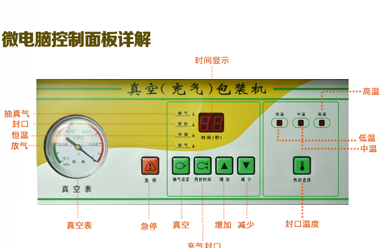 4、當(dāng)抽氣時間達(dá)到預(yù)設(shè)定時間時,抽氣結(jié)束,指示燈隨之熄滅,熱封指示燈亮,此時電磁閥工作,進(jìn)入封口程序,面板上舍友熱封時間及溫度調(diào)節(jié)按鈕,以適應(yīng)不同厚薄的材料,調(diào)節(jié)時間及溫度應(yīng)注意一定根據(jù)所需的包裝袋規(guī)格來調(diào)整。