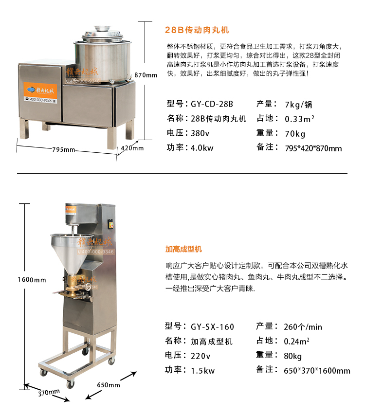 贛云2016新推出實(shí)用實(shí)心豬肉丸成套設(shè)備,本套設(shè)備采用:32b型不銹鋼強(qiáng)力絞肉機(jī)、28b型全封閉高速肉丸打漿機(jī)、160型加高肉丸成型機(jī)和1500型智能溫控雙加熱水槽。詳細(xì)參數(shù)如下