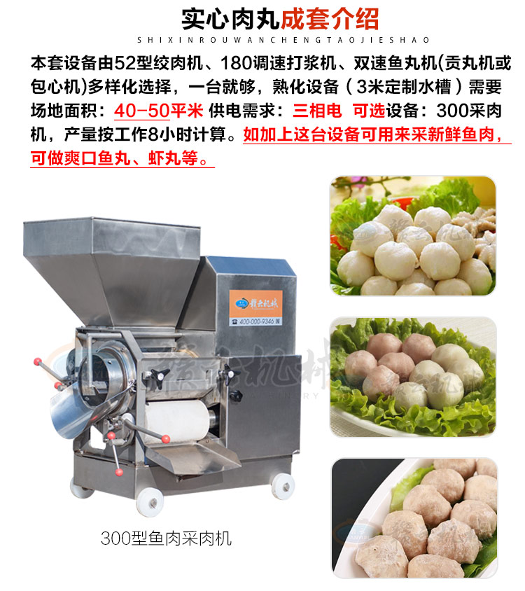 本套設(shè)備由52型絞肉機(jī)、180調(diào)速打漿機(jī)、雙速魚丸機(jī)(貢丸機(jī)或包心機(jī))多樣化選擇,一臺就夠,熟化設(shè)備(3米定制水槽)需要產(chǎn)地面積:40-50平米供電需要:三相電可選設(shè)備:300采肉機(jī),產(chǎn)量按工作8小時計算。如加上這臺設(shè)備可用來采新鮮魚肉,可做爽口魚丸,蝦丸等。