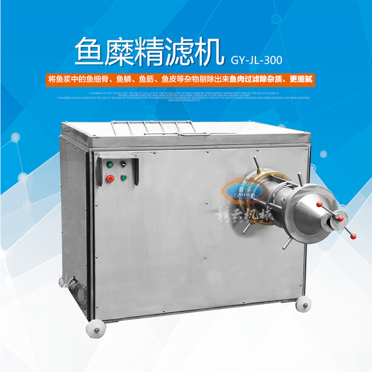 該機用于配套魚肉采取機、魚肉過濾除雜質(zhì),主要將魚漿中的魚細(xì)骨、魚鱗、魚筋、魚皮等雜物剔除出來,經(jīng)加工出來的魚糜精細(xì)光潔、口感好,是加工優(yōu)質(zhì)魚糜的機械。