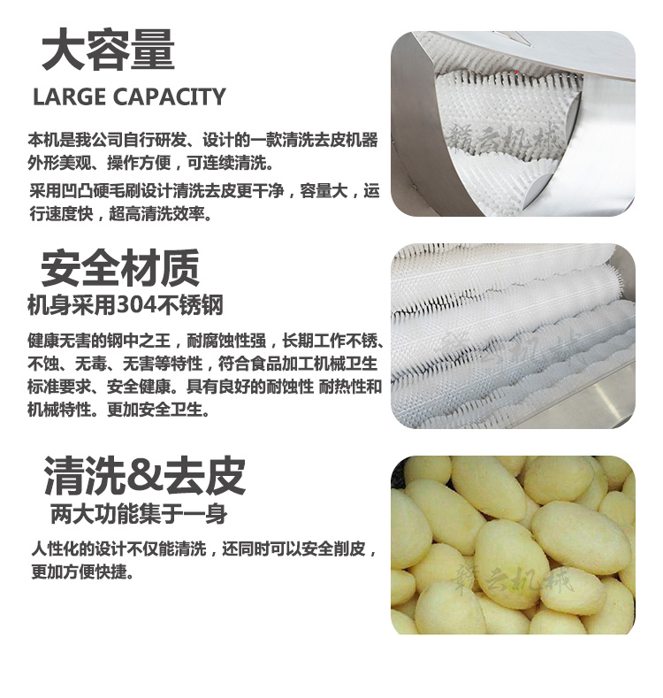加高毛輥清洗機是我公司自行研發、設計的一款清洗去皮機器,外形美觀,操作方便,可連續清洗。采用凹凸硬毛刷設計,清洗去皮更干凈,容量大,運行速度快,超高清洗效率。機身采用304不銹鋼材質,健康無害耐腐蝕性強,長期工作不銹、不蝕、無毒、無害等特性,符合食品加工機械衛生標準要求、安全健康。具有良好的耐蝕性,耐熱性和機械特性。更加安全衛生。清洗加去皮,兩大功能集于一身,人性化的設計,清洗的同時還能去皮。 本產品屬于定制產品,需要定制請聯系我們的客服哦!