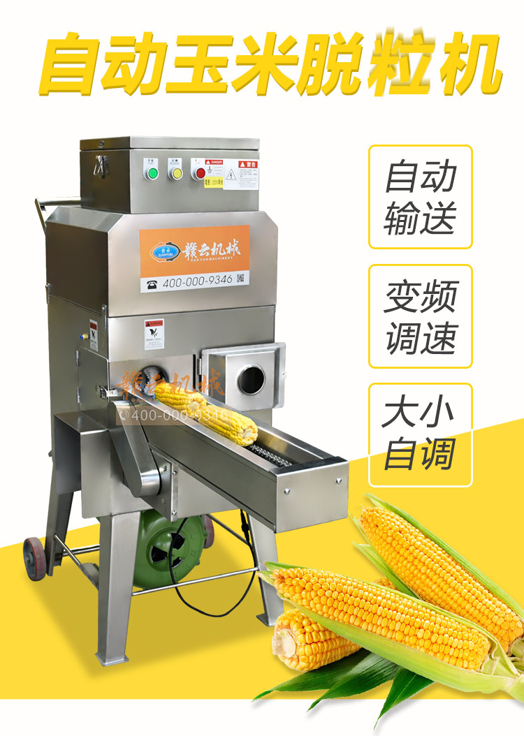 設(shè)計(jì)合理——整機(jī)采用全不銹鋼制造,配合腳輪移動方便;變頻器控速、操作簡單;適合各種鮮、甜、糯玉米、凍玉米解凍后脫粒;