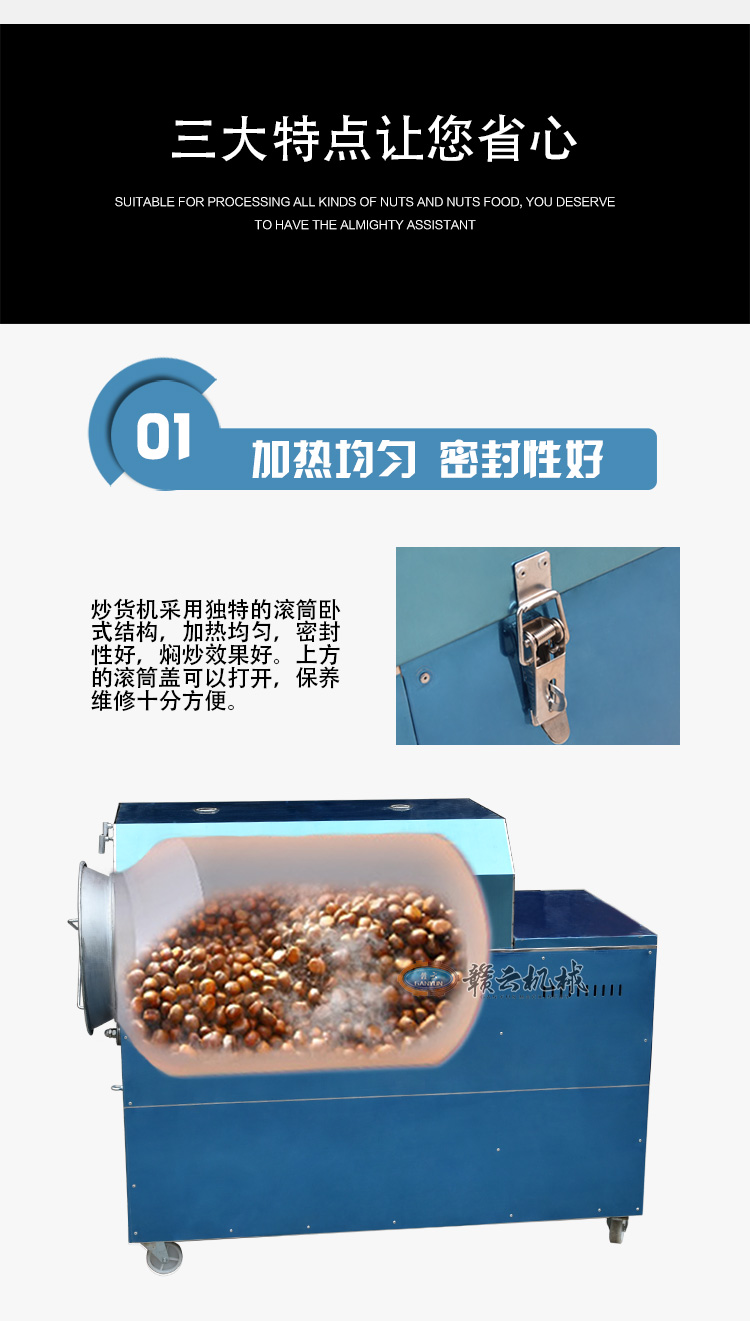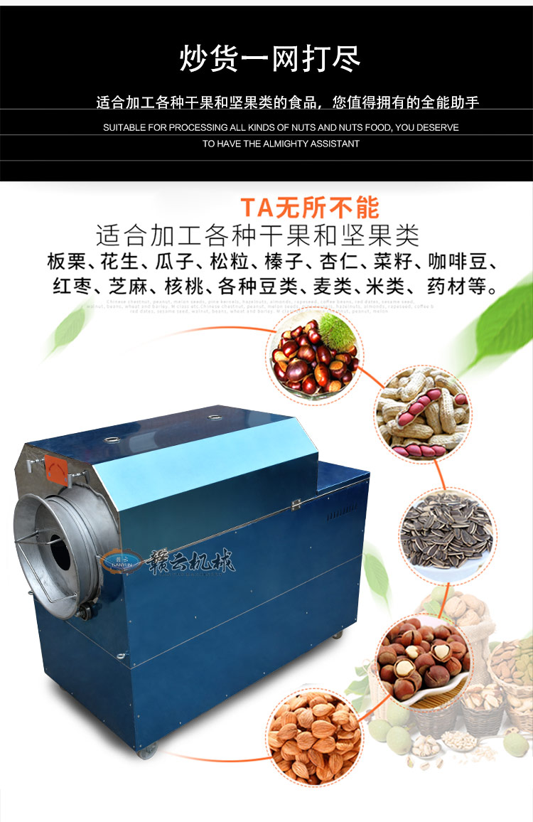 炒貨出入鍋十分方便,只需按動正反轉開關,電機既帶動滾筒反轉,炒貨和小石子會一同出鍋,自動分離,迅速快捷,省事不費力,干凈又衛生。是一種值得廣大中小投資者關注的好設備,適合于炒貨廠、商場、菜市場、超市居民區農村集市等固定經營,也可流動現炒。
