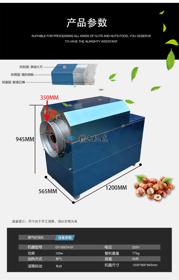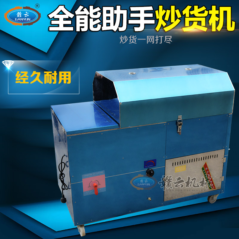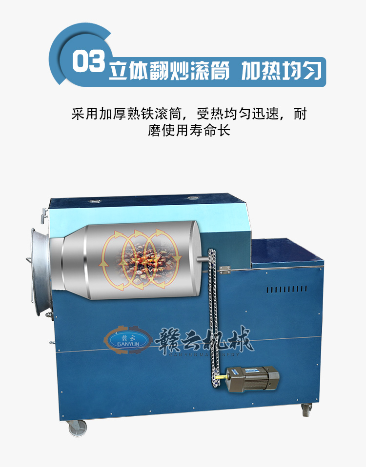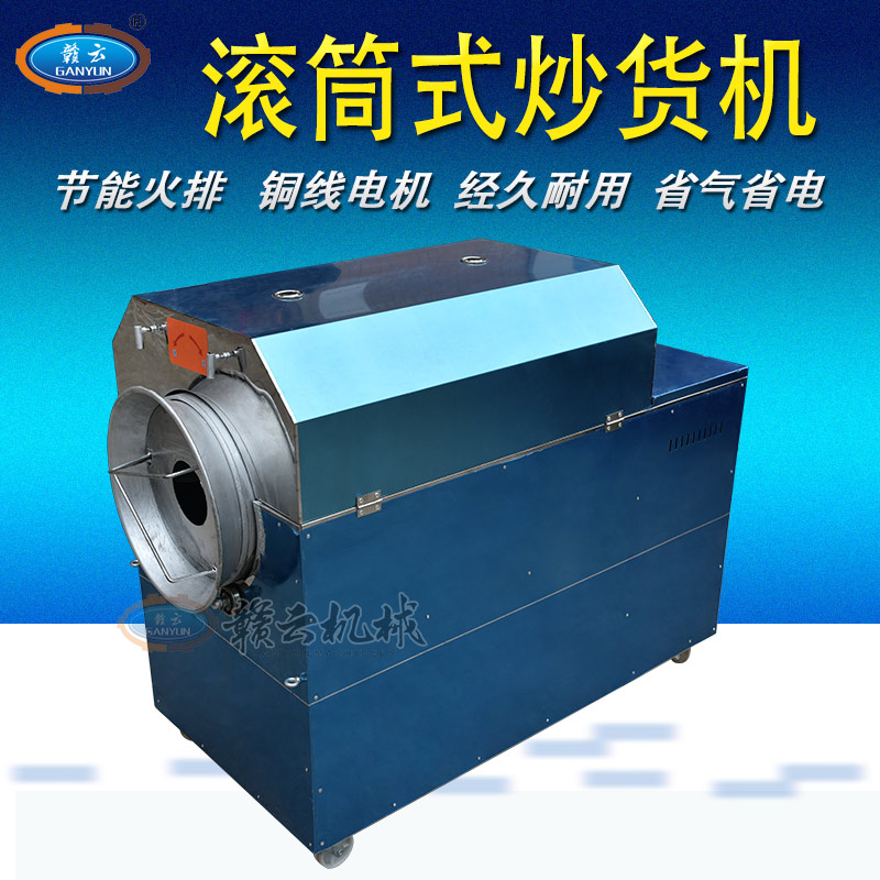 多功能炒貨機集各種大中小型炒貨機的優點為一體,可使用液化氣或燃煤作為加熱源,自動旋轉、自動翻炒、自動出鍋,整機采用優質不銹鋼板加工成形,外觀豪華氣派,美觀大方,清潔衛生,機器采用了先進的滾筒臥式結構,滾筒加熱均勻,并有保溫功能 , 工作時滾筒不停地旋轉,使炒貨食品上下、左右、前后、全方位立體翻炒,不會出現粘鍋現象,炒制出的食品色澤金紅亮麗,香氣撲鼻。