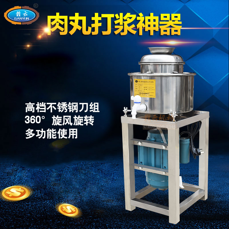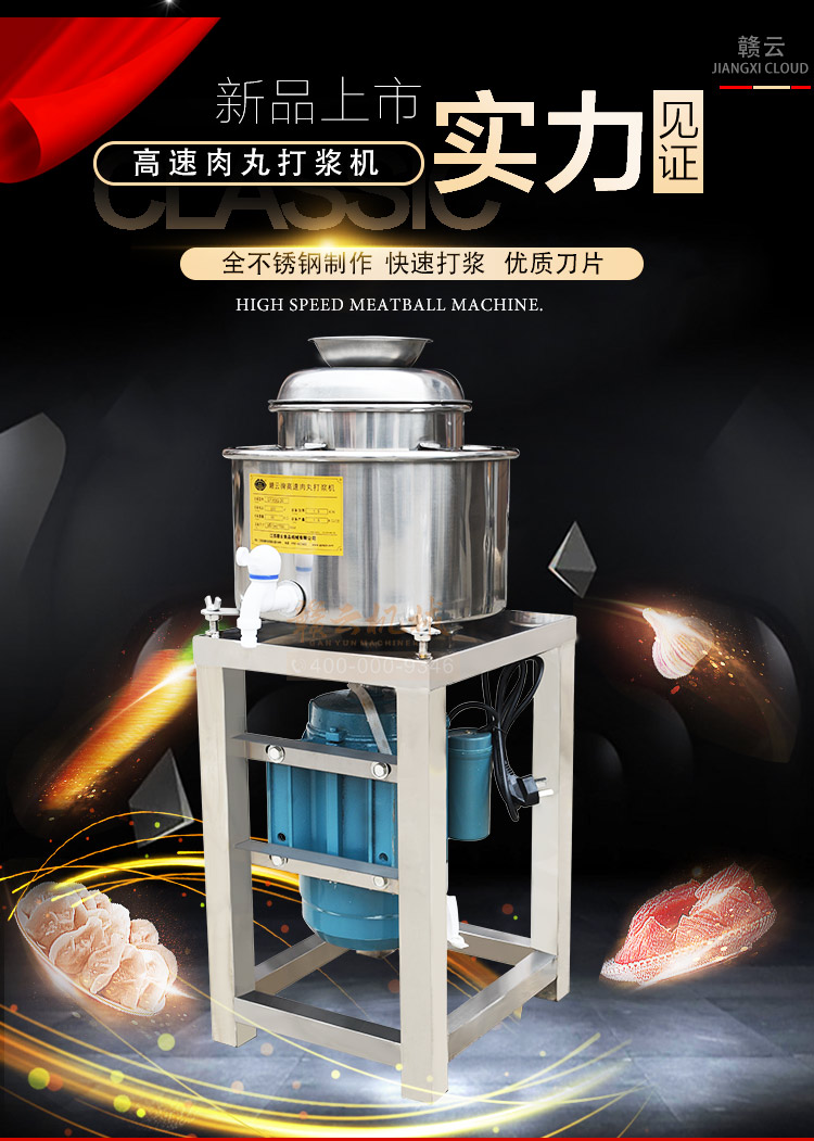 贛云牌新款全不銹鋼肉丸機,22型肉丸機采用全不銹鋼材質,在舊款全不銹鋼肉丸機的基礎上給支撐架加粗加厚,用不銹鋼蓋,打漿雙桶,刀柄刀片均采用不銹鋼材質。打漿桶裝肉量2L,一次可打肉漿4斤左右,采用2800r/min高速電機,故稱之為高速肉丸機。