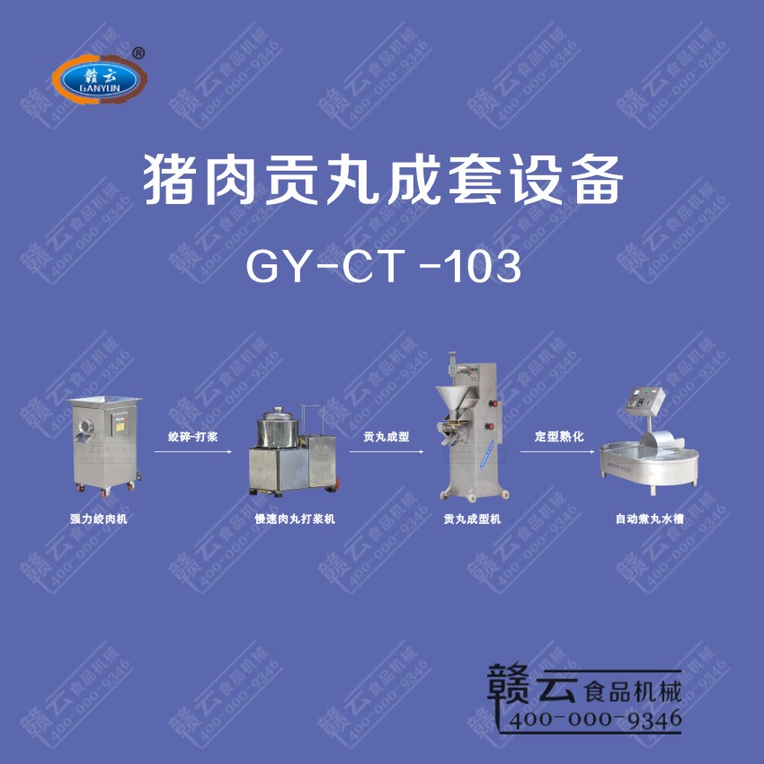 本套設備由:32型強力絞肉機、28型全封閉傳動高速肉丸打漿機、170型貢丸成型機和自動煮丸水槽四臺設備組合而成。全國統一價:25020元/套