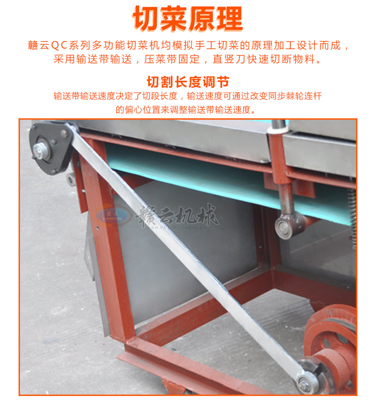 贛云QC系列多功能切菜機均模擬手工切菜的原理加工設計而成,采用輸送帶輸送,壓菜帶固定,直豎刀快速切斷物料,輸送帶輸送速度決定了切段長度,輸送速度可通過改變同步棘輪連桿的偏心位置來調整輸送帶輸送速度。適用于切片、丁、絲、條等多種樣式,使用范圍不僅僅局限于蔬菜領域,對米面食品、中藥材、筍類食品、各種小吃等切斷工序均適用,應用范圍廣、生產加工效能高,深受廣大客戶的青睞。