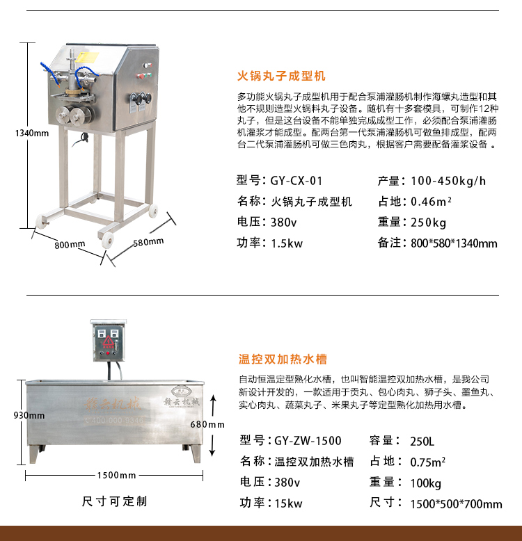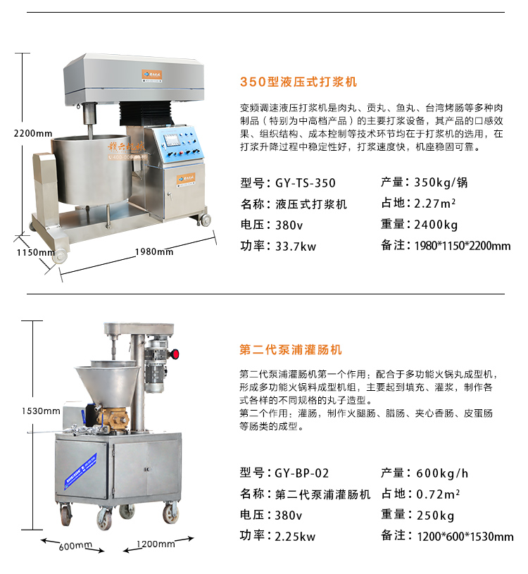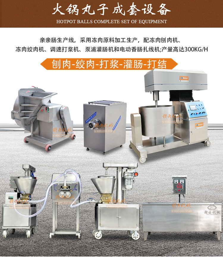 贛云推出的新款火鍋丸子成套設備由凍肉刨肉機、凍肉絞肉機、350型液壓打漿機、火鍋丸子成型機組、雙槽電加熱溫控水槽和雙室真空包裝機組合而成,日產可達3噸以上。