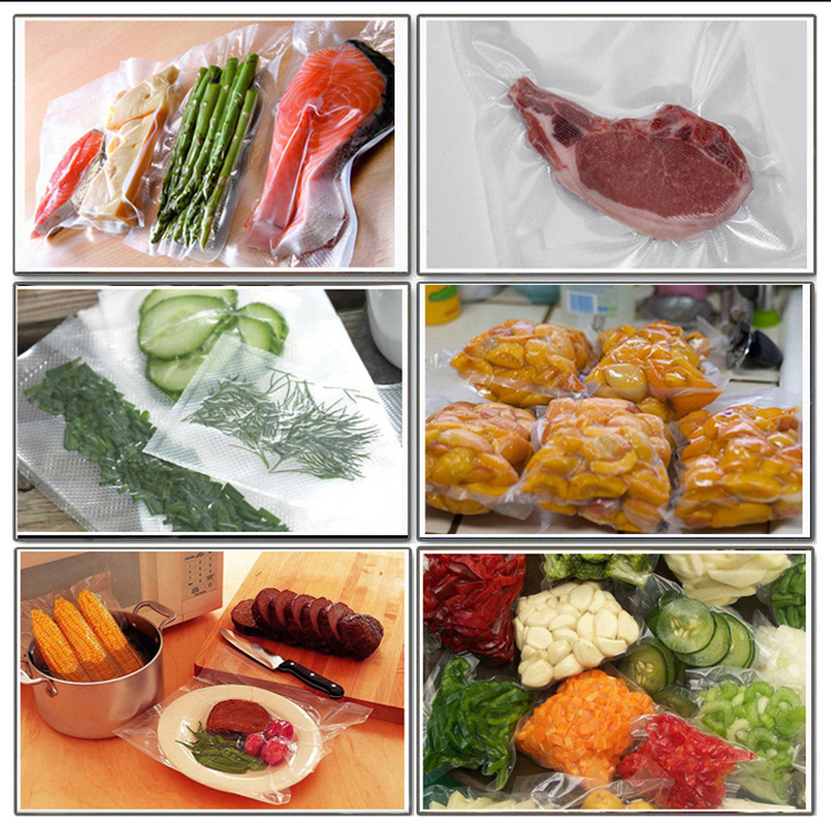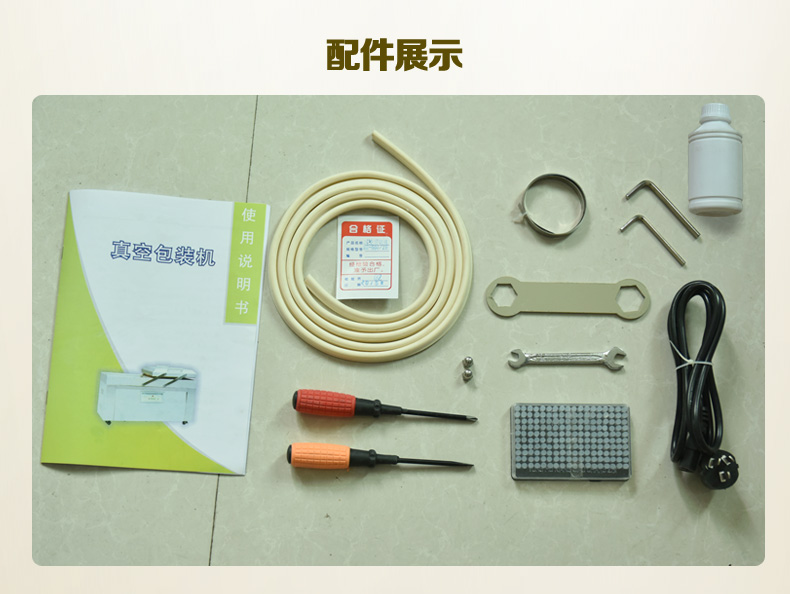 2、將所需包裝的物品裝入包裝袋【塑料復合袋或鋁箔復合袋】內,放入真空室內,提起壓條,均勻的把袋口置于熱封架上排好,然后放下壓條。