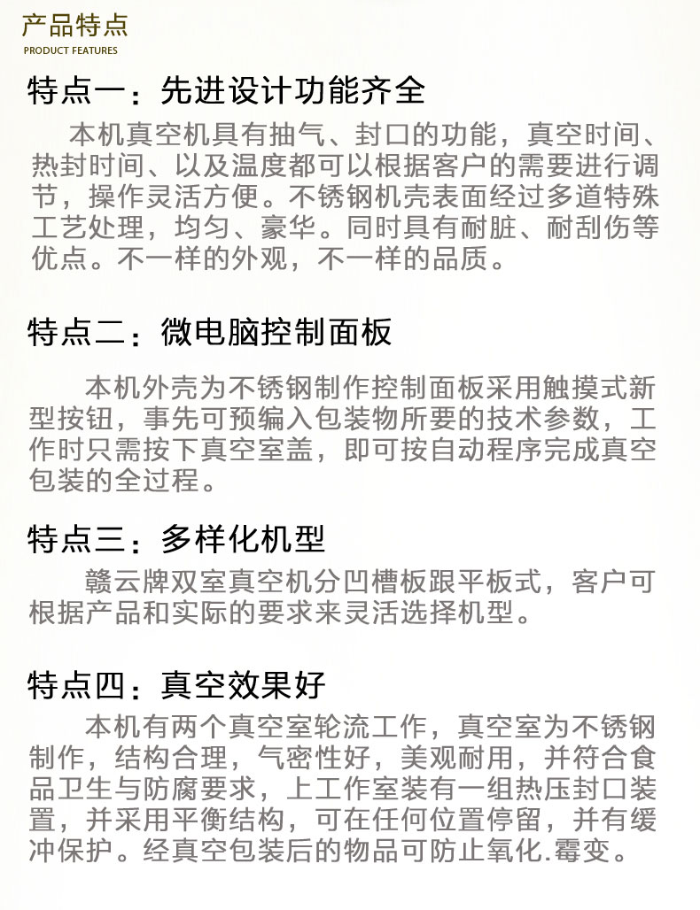 贛云牌真空包裝機是一種新穎的包裝機械,它是將包裝袋內抽成真空后、立即自動封口,袋內真空度高,殘留空氣少,防止了細菌等微生物的繁殖、避免了物品氧化霉變和腐敗、同時對某些松軟的物品、經人包裝后、可縮小包裝體積、便于運輸和貯存。