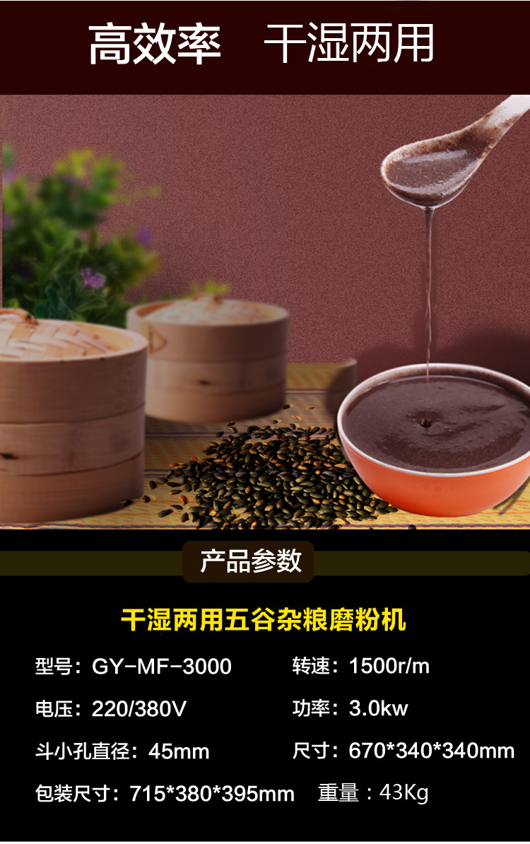 贛云不銹鋼磨粉機有1100型、2200型和3000型三種型號,這款是3000型不銹鋼磨粉機,造型外觀和2200型相同,采用干濕磨盤以及全不銹鋼構架,外形美觀大方,亮光,不銹鋼色澤清洗,采用3kw大功率純銅電機帶動磨盤轉動,磨粉細度可調,適合磨不同粗細的五谷,米漿等。
