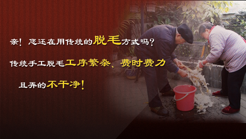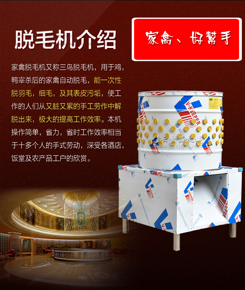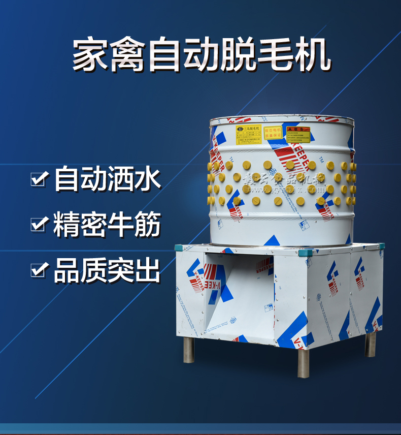 家禽脫皮機,用于雞,鴨宰殺后的家禽自動脫毛,能一次性脫羽毛,細毛,及其表皮污垢,使工作的人們從又臟又累的手工勞作中解脫出來,極大的提高工作效率。本機操作簡單,省力,省時工作效率相當于十多個人的手式勞動,深受各酒店,飯堂及農產品工戶的欣賞。