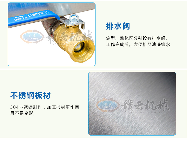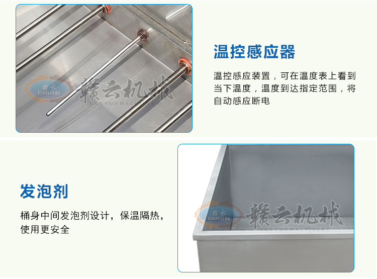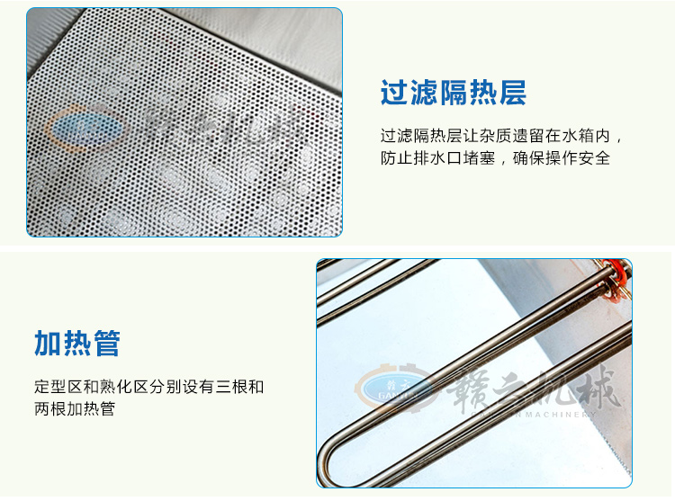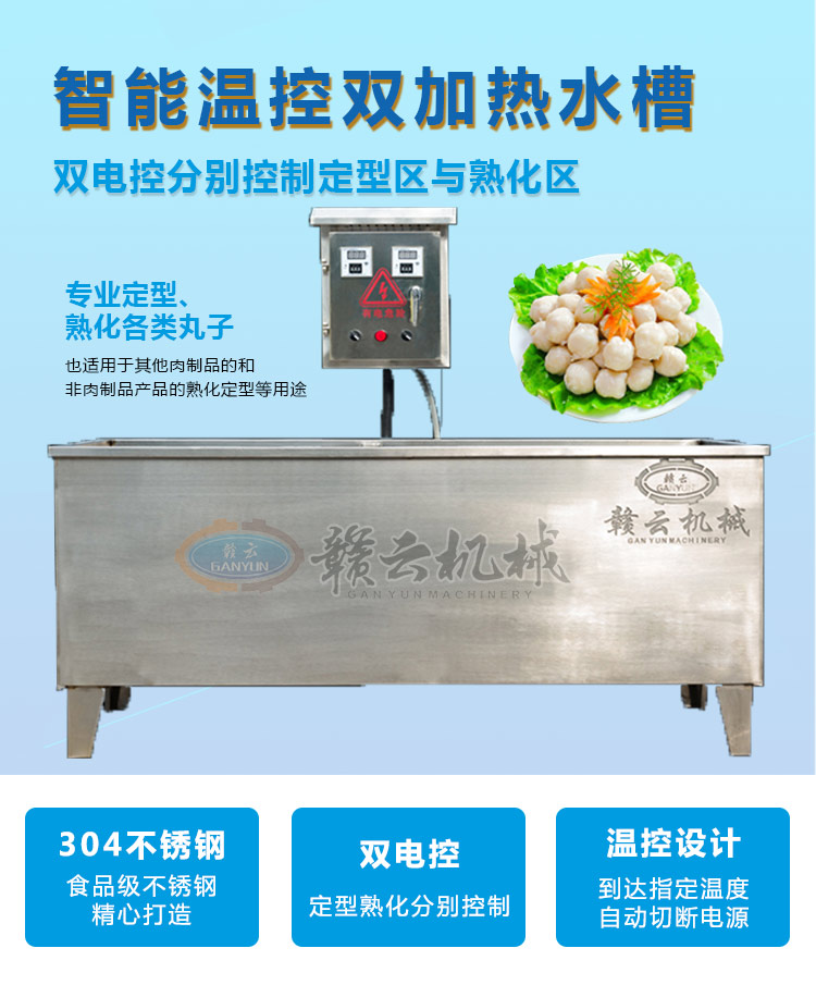整機采用304不銹鋼板材設計,中間采用發泡劑,取保溫隔熱作用,雙槽加熱,獨立控制,定型熟化分別控制,加熱速度快,省電更省心。本產品量身設計可配套用于我廠生產的包心肉丸機、牛肉貢丸機、墨魚丸成型機、獅子頭成型機、雙調速肉丸機、火鍋丸子機組等多種肉丸成型設備使用。可加油,用于油炸丸子的定型熟化,可加水,用于各種肉丸的定型熟化,根據其加熱作用原理,也適用于其他肉制品的和非肉制品產品的熟化定型等用途。