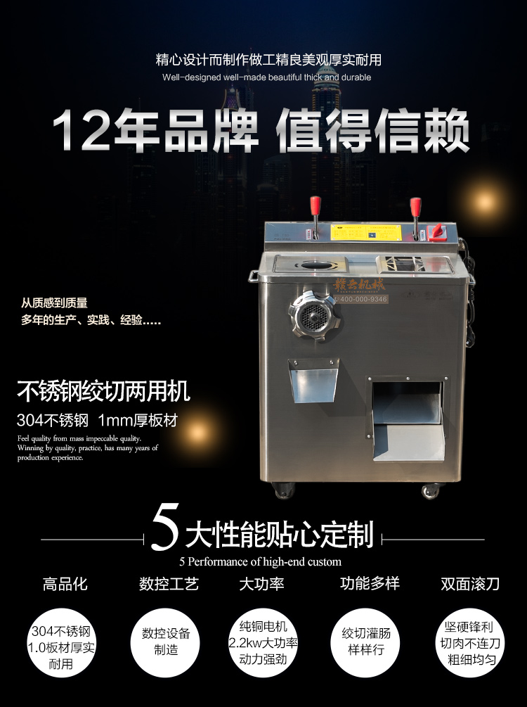 贛云2017款304不銹鋼絞切機(jī)上市,火熱開賣中,裝配2.2kw 大功率純銅電機(jī),采用1mm標(biāo)準(zhǔn)厚304不銹鋼板材封裝,離合開關(guān)設(shè)計(jì),絞肉切肉一體。適合高端酒店場所之用,同樣也適合品質(zhì)優(yōu)質(zhì)店鋪和檔口絞肉切肉之用。十二年品質(zhì)保證,值得擁有!
