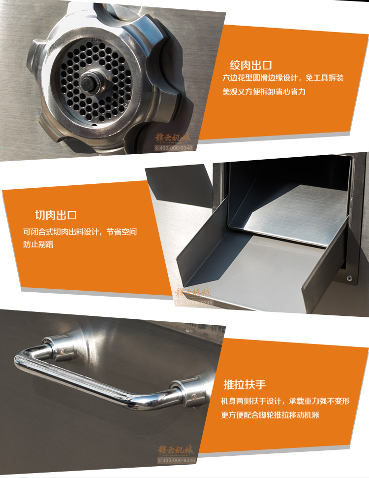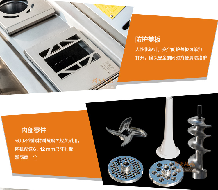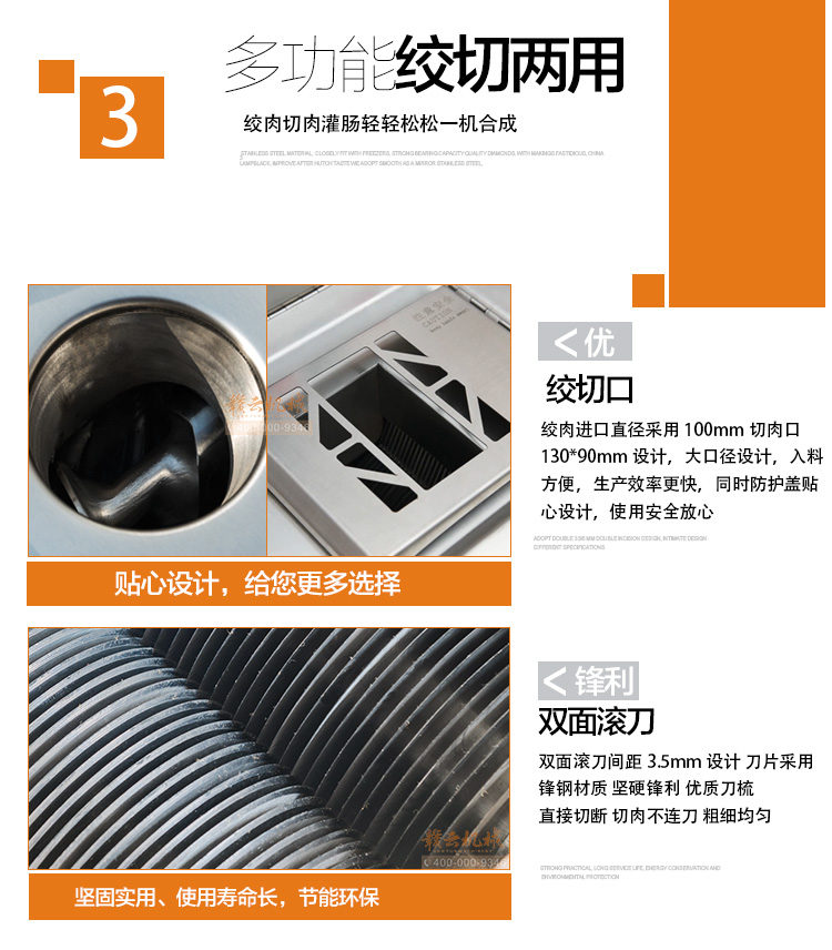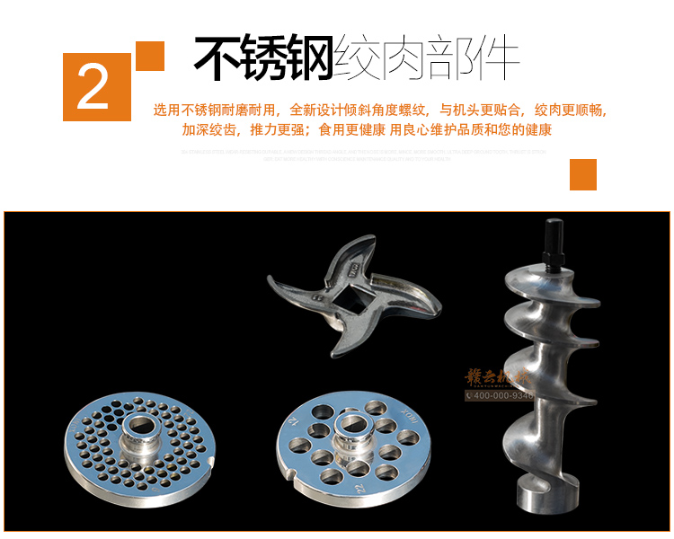 本機(jī)采用304不銹鋼板材封裝設(shè)計(jì),絞肉十字刀、絞龍及圓刀采用201不銹鋼材質(zhì),切肉刀采用特殊加硬鋼材,激光開刃鋒利耐用,雙滾切肉效果好,肉片規(guī)則均勻。不銹鋼絞龍絞齒深,咬力更大,絞肉更強(qiáng)勁,離合開關(guān)設(shè)計(jì),操作方便耐用。