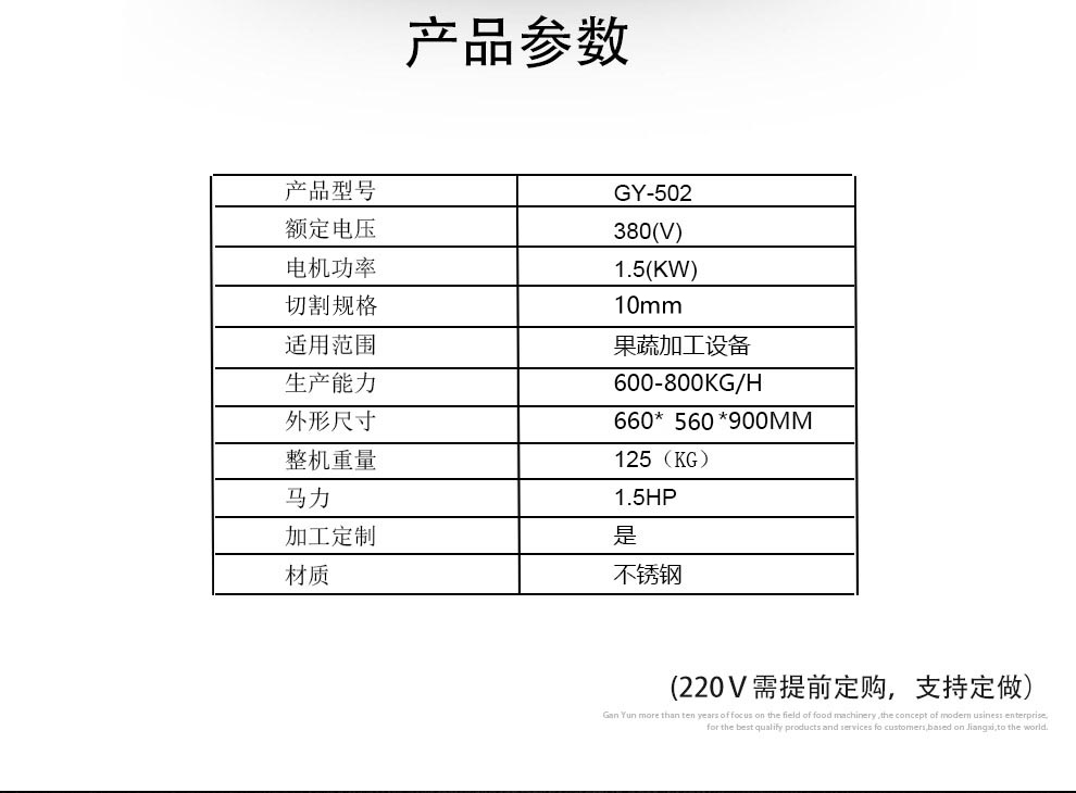 產品簡介:GY-ST-502切薯條薯片機主要用于將塊莖類的果蔬切成片狀或是條狀,刀片采用優質不銹鋼材料制造,鋒利無比,使切削出來的薯條薯片表面光滑。本機操作簡單,效率高,便于清潔。機器外部全部采用不銹鋼與鋁合金制造,所有與食物接觸的零部件均采用不銹鋼和鋁合金材料制作,主要用于薯條加工、酒店、餐飲店和相關的食品加工行業。