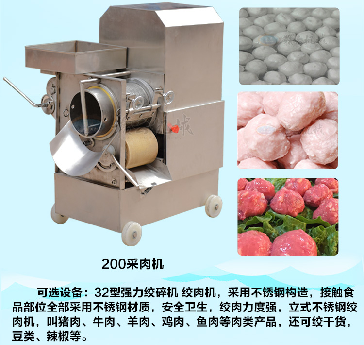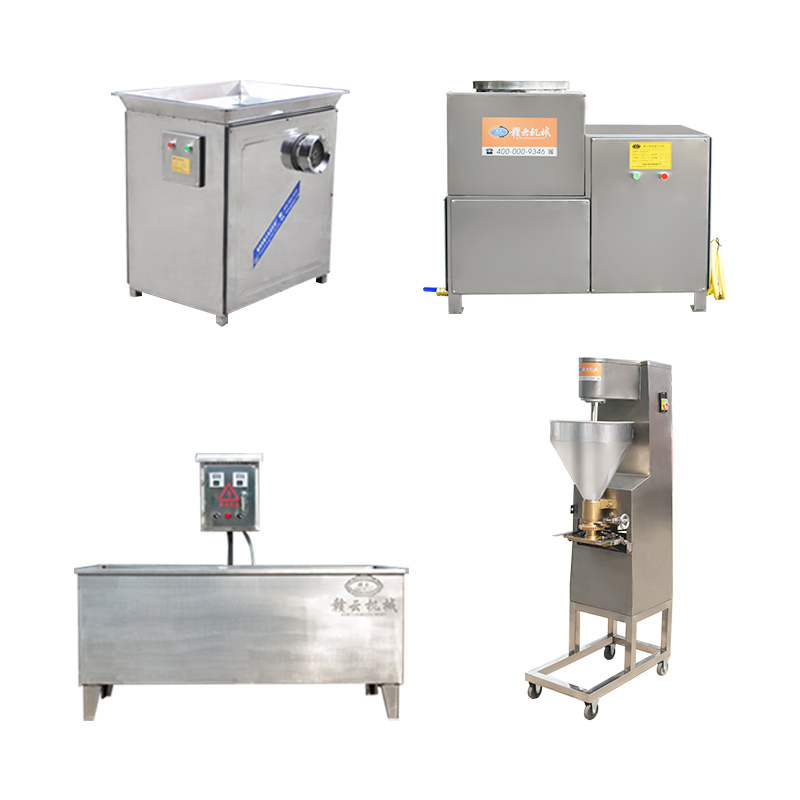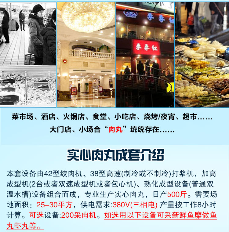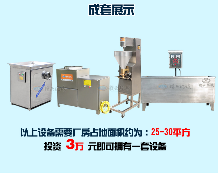 本套設備由42型絞肉機,38型高速(制冷或不制冷)打漿機,加高肉丸成型機(2臺或者雙速成型機或者包心肉丸機)、熟化成型設備(普通雙溫水槽)設備組合而成,專業生產實心肉丸,日產500斤。需要場地面積:25-30平方,供電需求:380V(三相電)產量按工作8小時計算?蛇x設備:200型采肉機。如選用一下設備可采新鮮魚糜做魚丸蝦丸等。