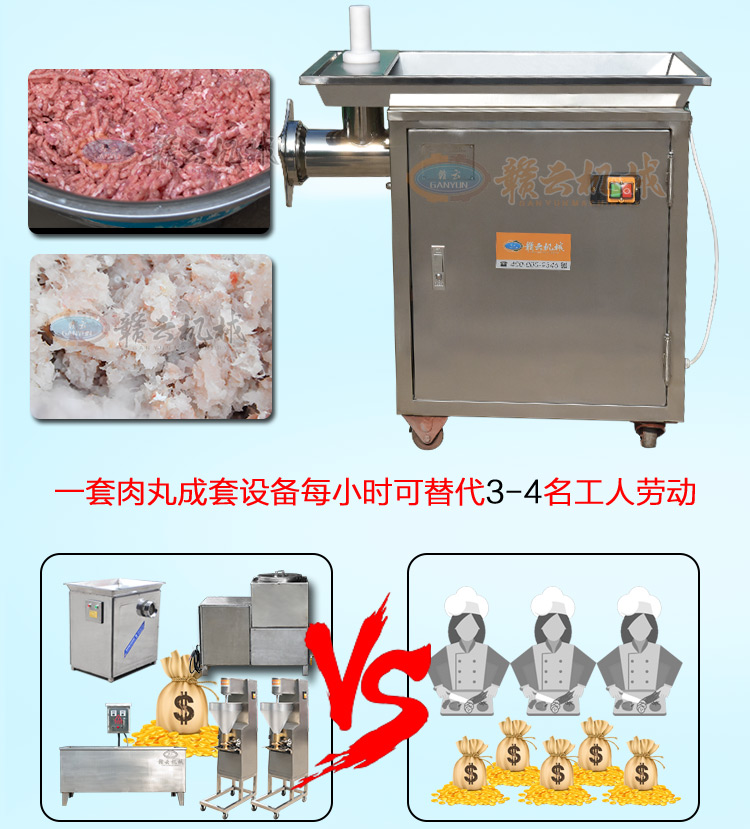 該套設備是生產500斤實心肉丸成套設備,一次性成本,持續收益,低門檻,高收益。3-4人人工生產肉丸,日產量200-300斤,效率低,速度慢。每月還需要支付昂貴的工資。而機器的日產量500斤,成型效果好,節約人工成本,一套機器可以用大概10年-20年。