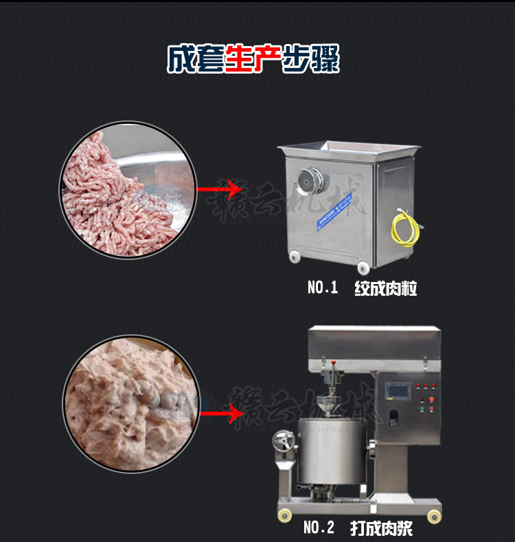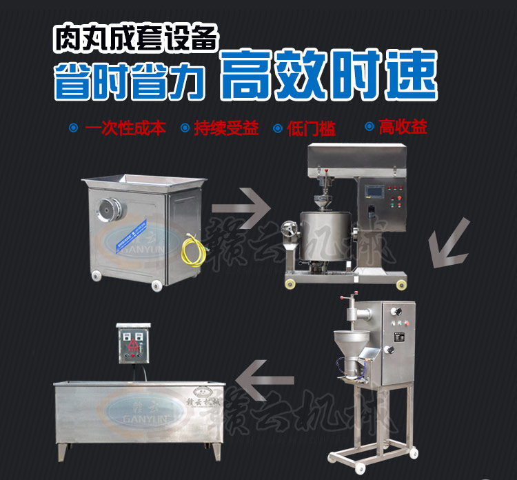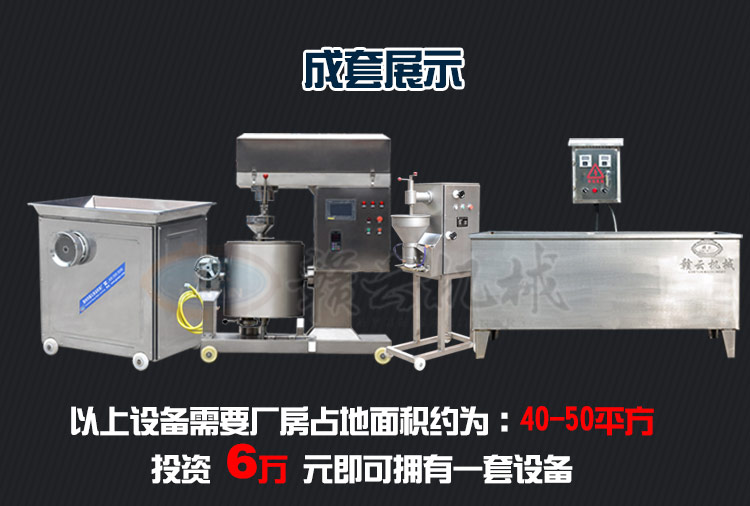 本套設備由52型絞肉機、180調速打漿機、雙速魚丸機(貢丸機或包心機)多樣化選擇,一臺就夠,熟化設備(3米定制水槽)需要產地面積:40-50平米供電需要:三相電可選設備:300采肉機,產量按工作8小時計算。如加上這臺設備可用來采新鮮魚肉,可做爽口魚丸,蝦丸等。
