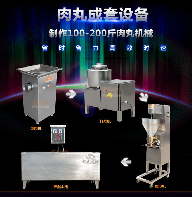 本套設備由32型絞肉機、28型高速(慢速)打漿機、加高成型機、熟化成型設備(雙溫水槽)4太設備組合而成,專業生產實心肉丸,日產100-200斤。需要場地面積:25-30平方米,供電需求:380V(三相電)可選設備:200采肉機