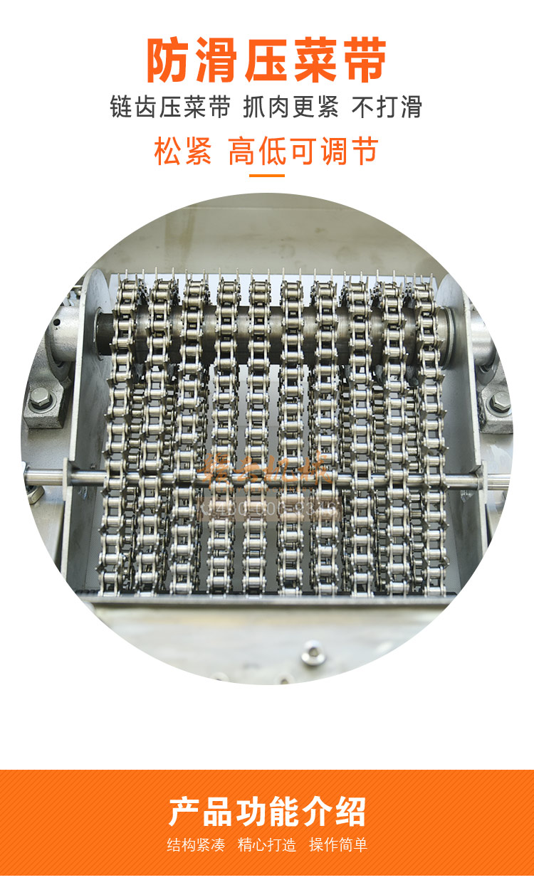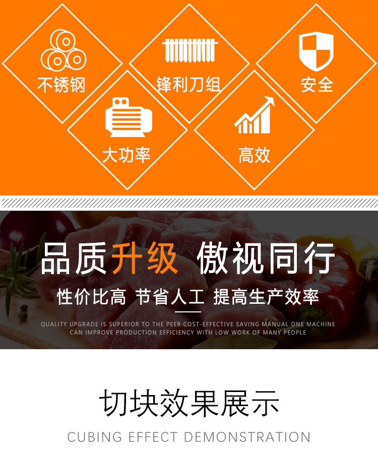 適用于雞、鴨肉、中小型動物骨頭、排骨、冷凍肉、鮮肉、凍雞、雞腿等加工設備,可根據需要剁塊、段、條等形狀大小可調。本機性價比高,節省人工,一機可抵多個人工作,每小時可剁切1000公斤,大大提高生產效率。廣泛用于大中小型食品加工廠、集體食堂、屠宰場、肉聯加工廠、超市、飯店等地使用。