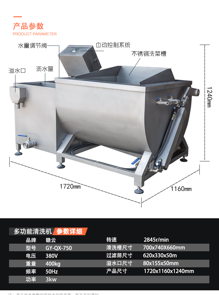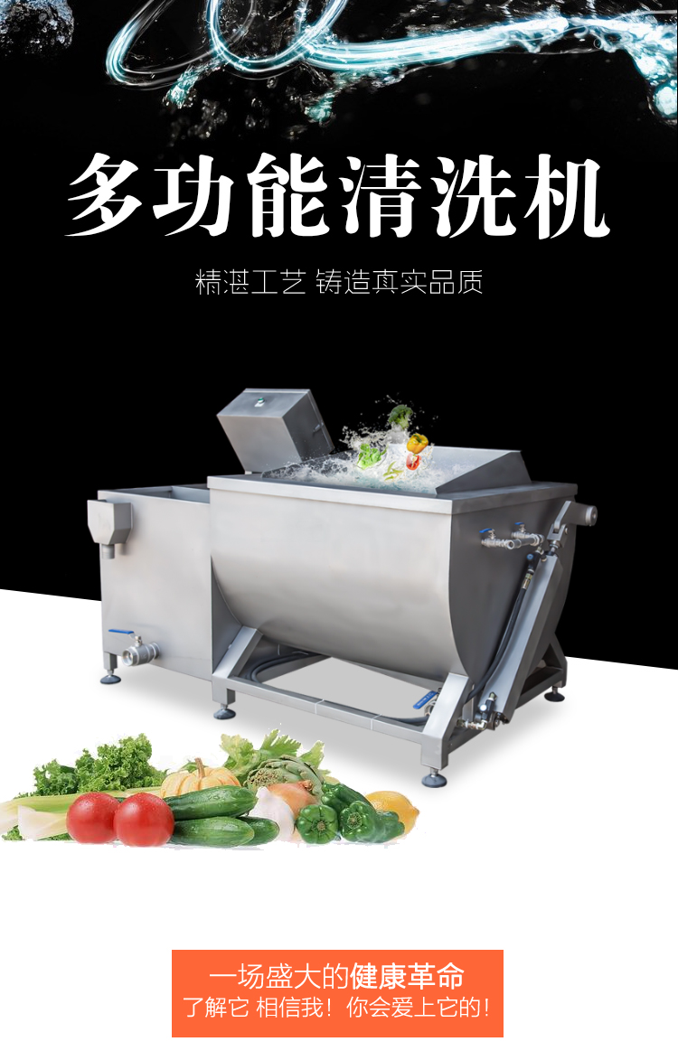 多功能清洗機,采用sus304不銹鋼材質,噴砂亞光處理。采用先進技術,自動化控制,清洗時間可在0-30分鐘內自由設置;翻轉裝置設計,可通過電控箱控制升降臂桿升降不銹鋼瀝水筐。清洗槽U型設計,泥沙污垢沉降底部,渦流清洗系統,清洗徹底且不損傷蔬菜,適合大部分果蔬的清洗,例如清洗切割好的各種蔬菜以及洋椒、豆角茄子、辣椒、筍干等。