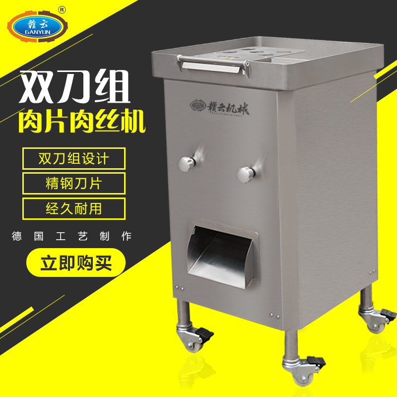贛云360切肉機,使用雙組刀設計,可以對里脊肉、豬肉、牛肉、雞肉等加工切片切絲,也可對富有彈性的果蔬切片切絲,如:辣椒、魔芋等切片切絲,切出的肉片肉絲厚薄均勻,適用于預制菜加工、肉制品加工設備、中央廚房加工設備、食堂設備中使用