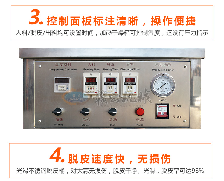 通過電、氣原理控制入料、脫皮、出料程序,實現完全自動化,連續工作,大大降低人力勞動強度