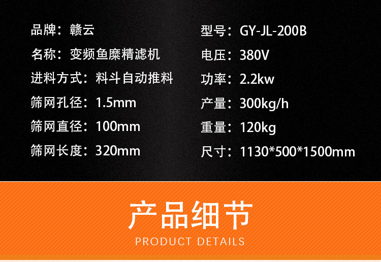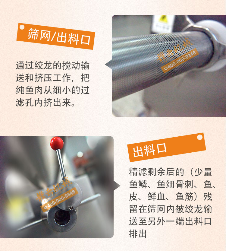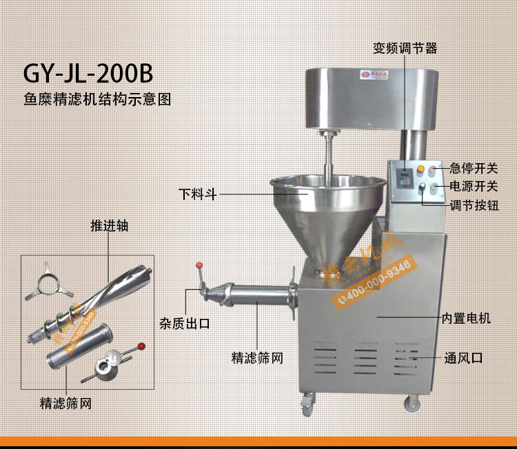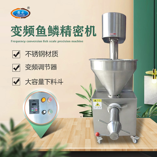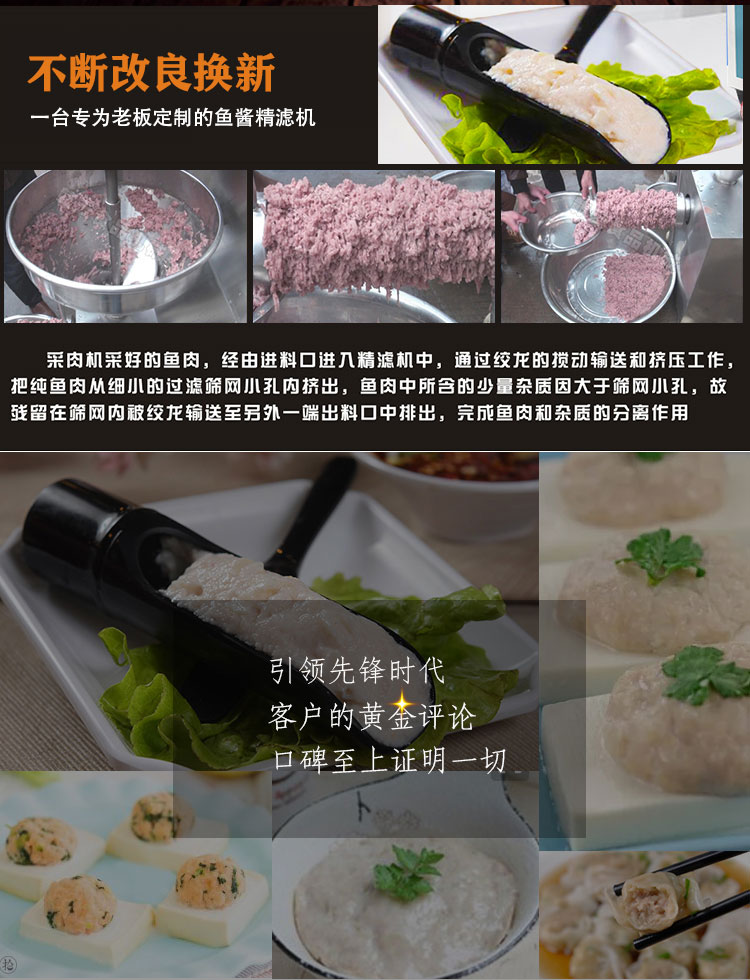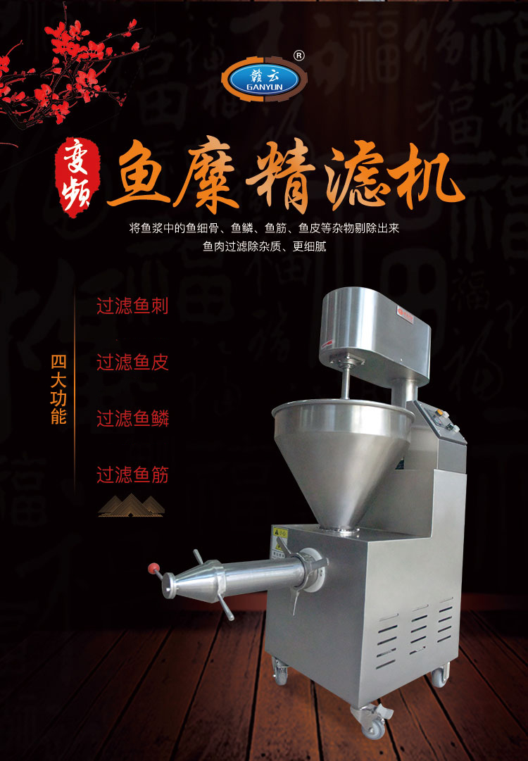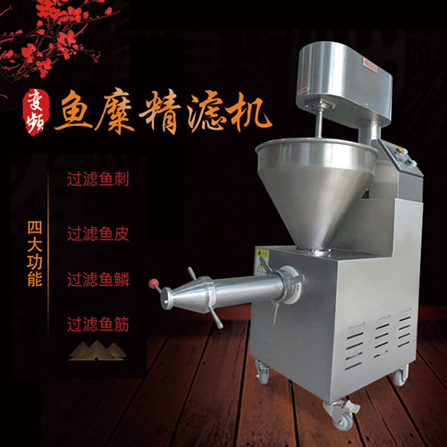 魚糜魚肉精濾機,商用變頻自動化過濾魚肉魚刺魚骨機,魚肉雜質過濾機可對魚肉采肉機采出來的肉進行進一步精濾,去除殘余魚鱗,魚筋,魚皮,魚血等雜質,在加工高端魚丸、魚豆腐、魚餅這些對肉質要求高的魚類制品,需要經過此款精濾機再過濾,是魚糜加工生產設備。 先經過采肉機將采好的魚肉,在經由進料口進入精濾機中,通過絞龍的攪動輸送和擠壓工作,把純魚肉從細小的過濾篩網小孔內擠出,魚肉中所含的少量雜質因大于篩網小孔,故殘留在篩網內被絞龍輸送至另外一端出料口中排出,完成魚肉和雜質的分離作用