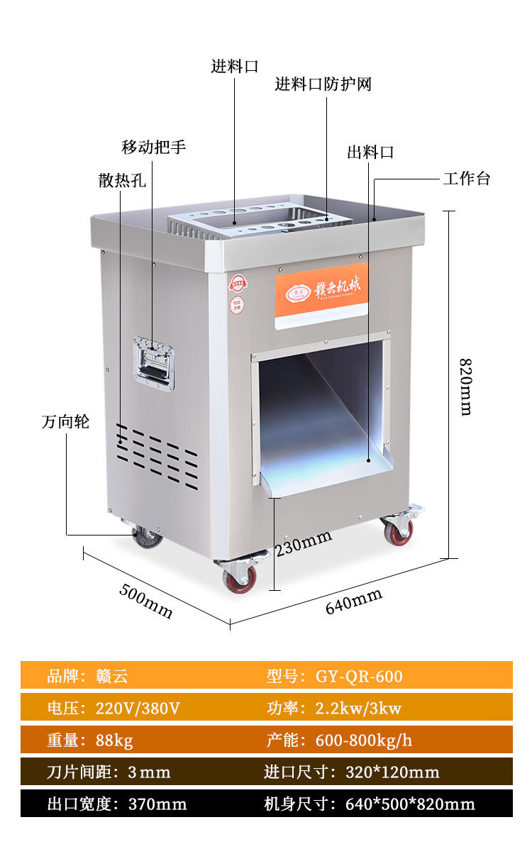贛云工程款切肉機,可以切各種肉類,切片、切絲、切末一機搞定,也可以切軟蔬菜,例如:榨菜、魔芋、香菇、辣椒等,贛云新款切肉機配置新升級,使用優質大功率電機,采用不銹鋼機身,機器機身清洗方便,增加安全防護,加大了入料口,增加工作效率,新款商用切肉機一機多能,可以滿足多樣需求。