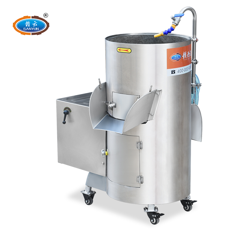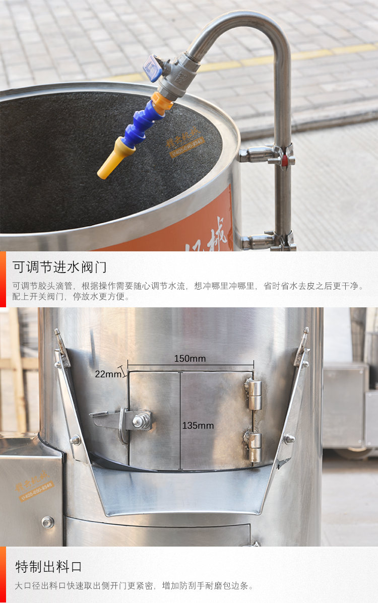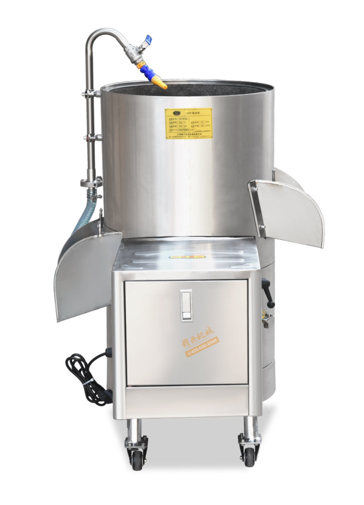 初次使用土豆脫皮機前,請先檢測機器的各個部件是否齊全和安裝穩固,并且電源是否正確接通,可參閱土豆脫皮機使用說明書,在檢測無誤后,先將土豆放入脫皮機的料桶后,將電源開關打開,電源開啟后,料桶地盤通過高速旋轉將不斷翻動土豆并且讓土豆與周邊磨砂摩擦達到去皮效果,高速帶動土豆在料桶壁上不停的碰撞摩擦,使土豆去皮效率高。土豆脫皮機料桶底盤采用沙盤構成,凸起部位設計,有效翻動食材,和桶壁磨砂高度配合,360度全面脫皮不殘留。在通過可調節膠頭滴管,根據操作需要隨心調節水流,想沖哪里沖哪里,省時省水去皮之后更干凈配上開關閥門,停放水更方便,可以保證出工后的土豆干凈、清潔。