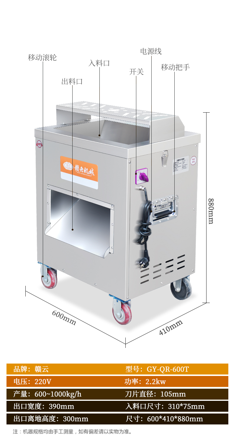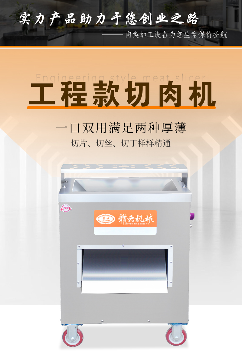 贛云工程款切肉機,可以切各種肉類,切片、切絲、切末一機搞定,也可以切軟蔬菜,例如:榨菜、魔芋、香菇、辣椒等,贛云新款切肉機配置新升級,使用優質大功率電機,采用不銹鋼機身,機器機身清洗方便,增加安全防護,加大了入料口,增加工作效率,新款商用切肉機一機多能,可以滿足多樣需求。