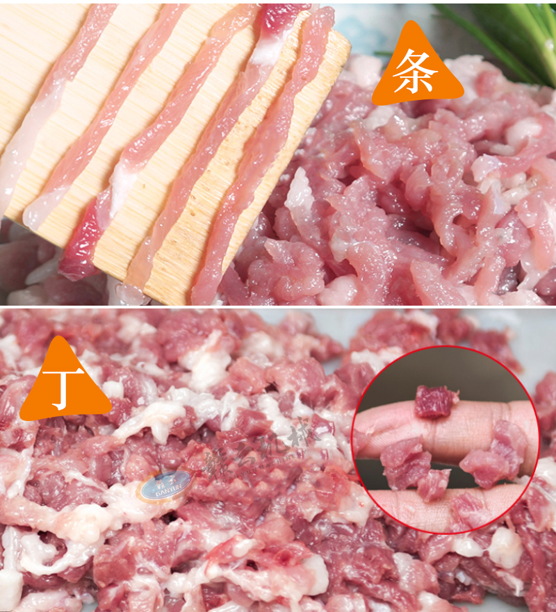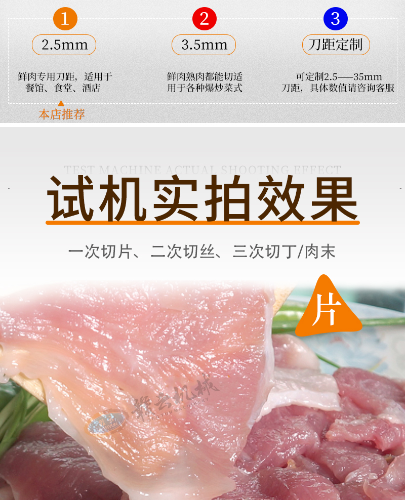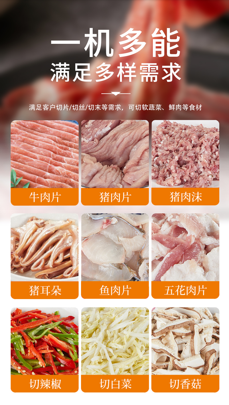 適用于鮮豬肉、牛肉、羊肉、魚肉、雞胸肉等各種肉類的切片、切絲、切末,也可以切軟蔬菜,如:榨菜、魔芋、香菇、辣椒等切片切絲切末。