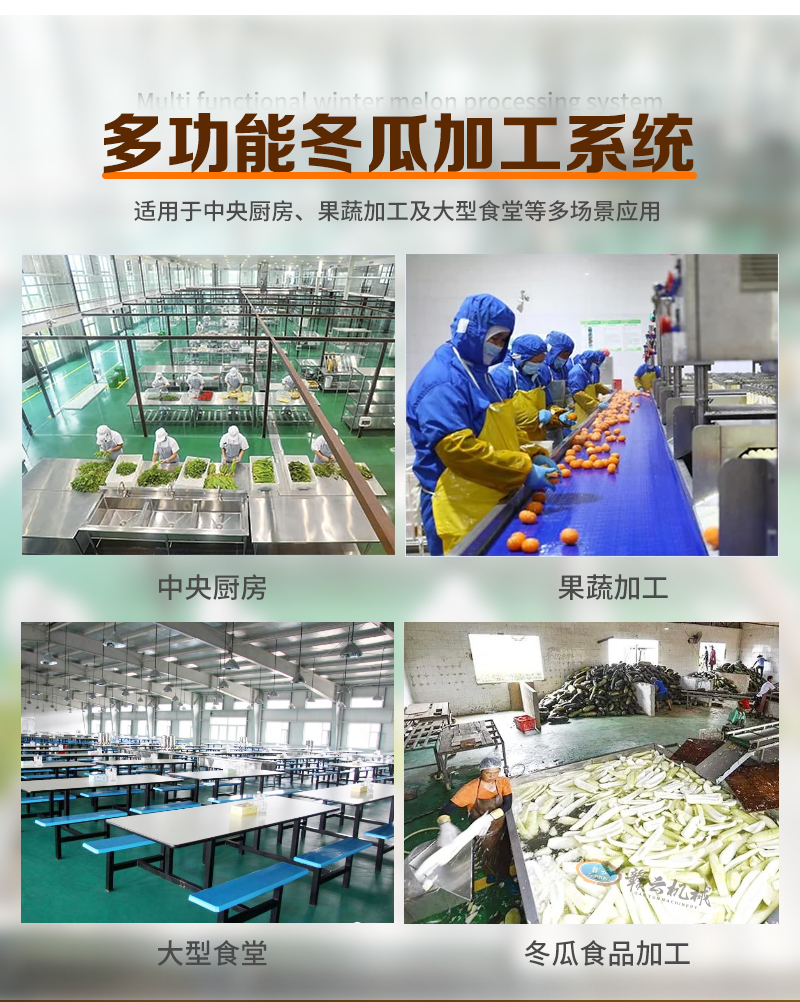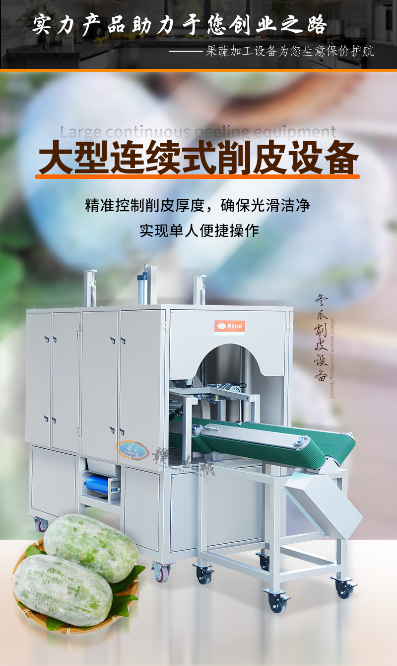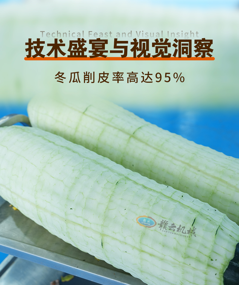 通過對大冬瓜進行旋轉高效快速的自動去皮,去皮干凈,適用于央廚、營養配餐、加工廠等大量冬瓜處理,可搭配連續式進料實現流水線作業。