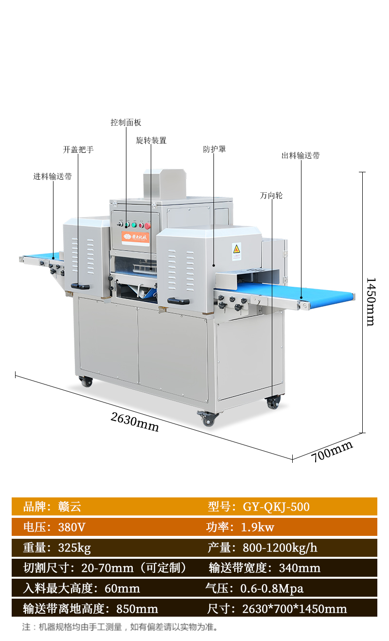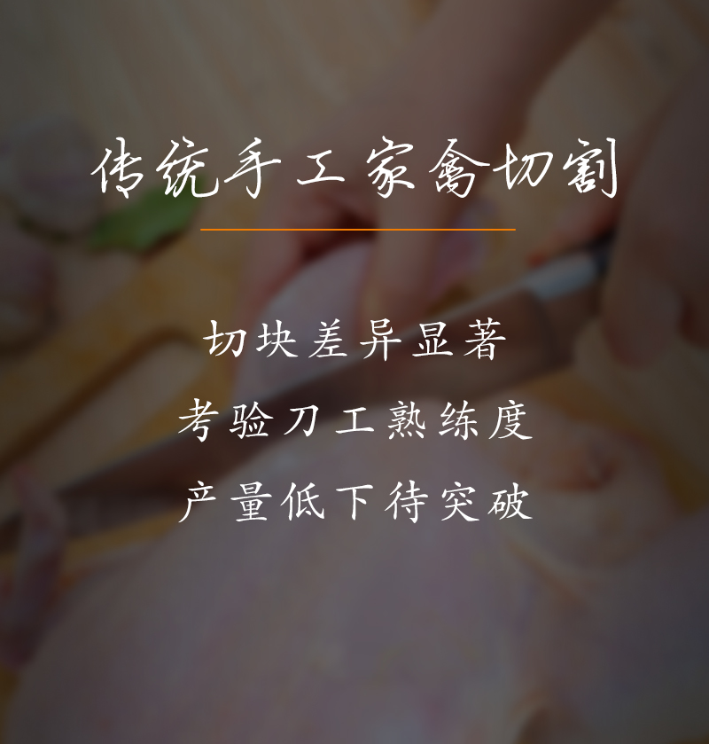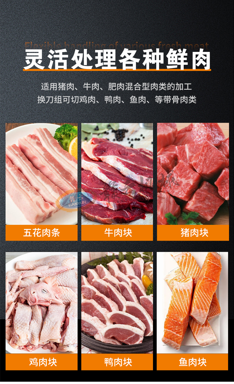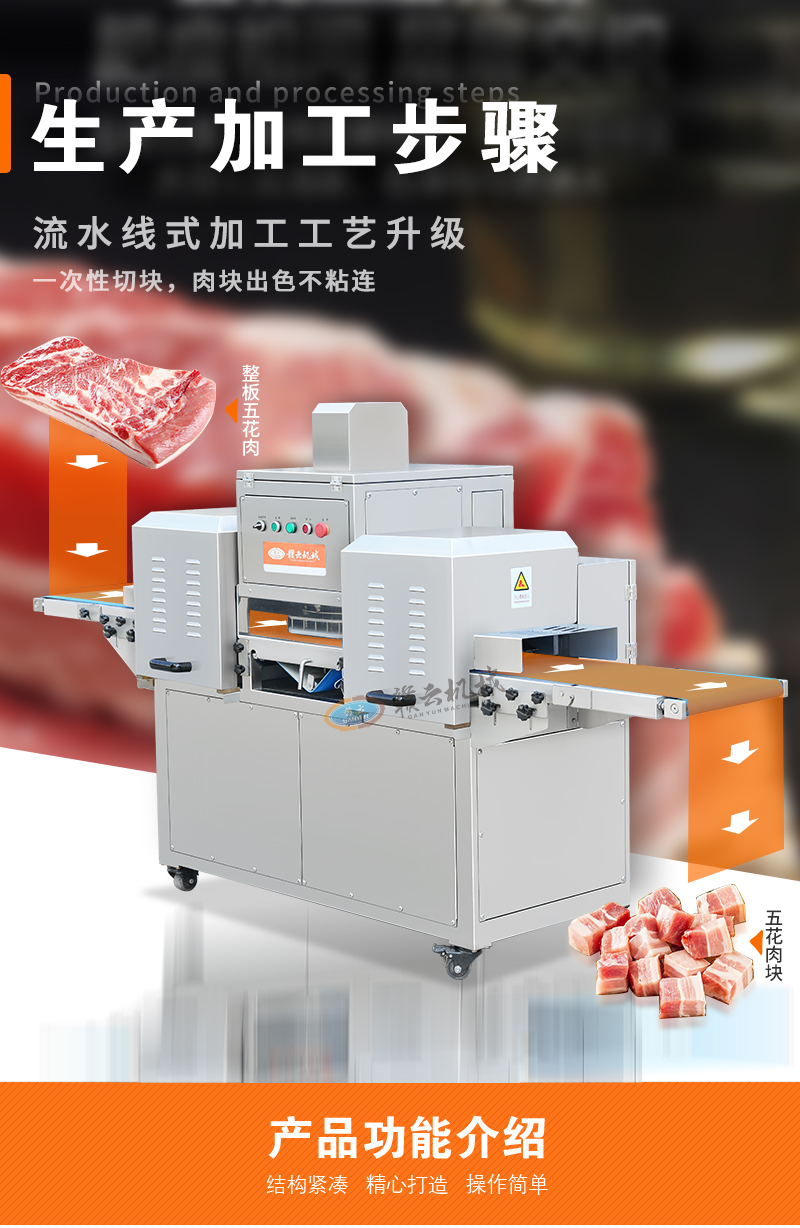 適用于:五花肉、牛肉、魚、雞、鴨等鮮肉和家禽的快速切塊,一次成塊。