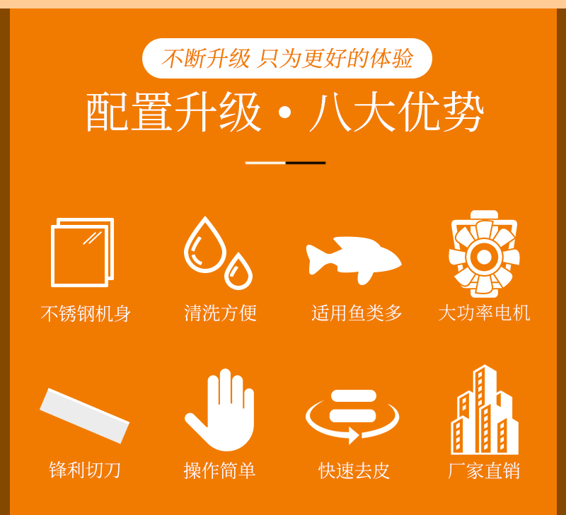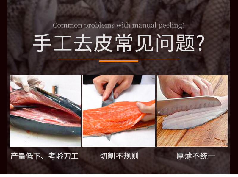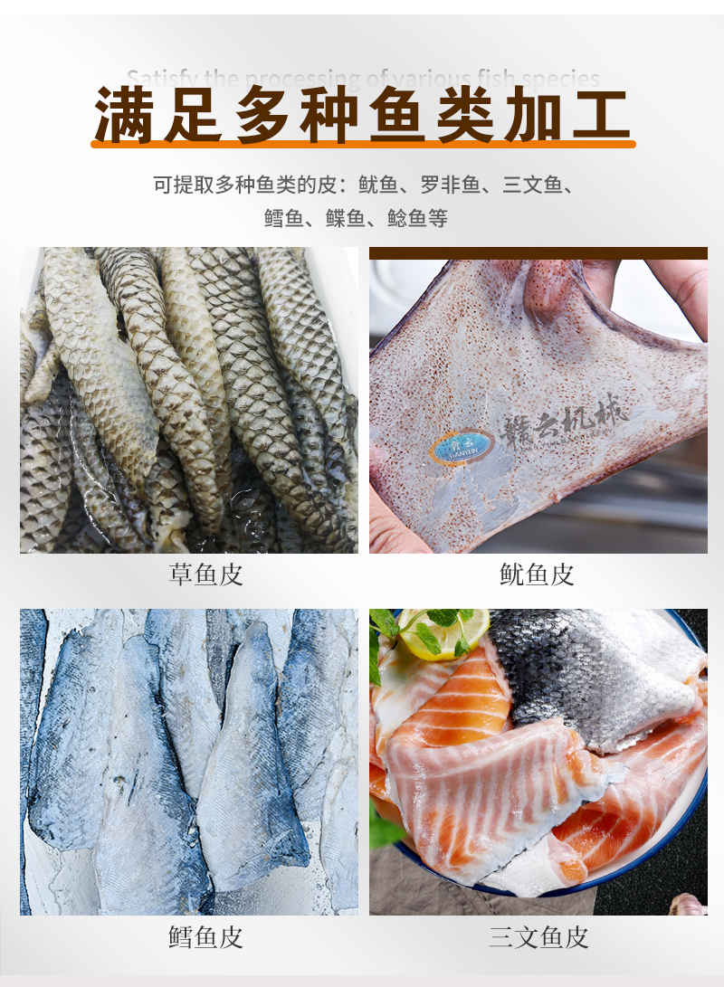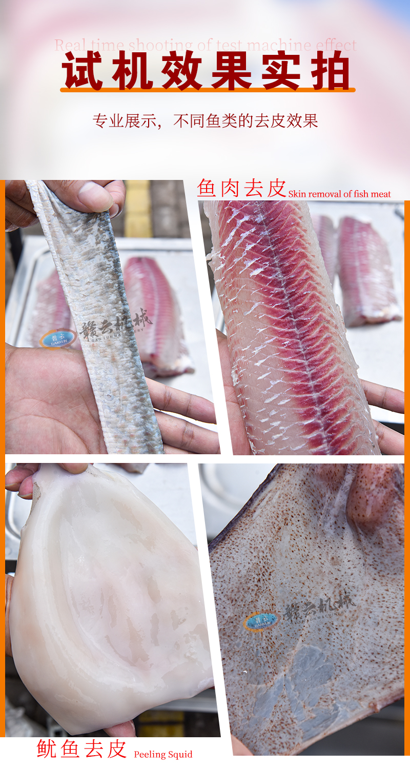 適用于草魚、鯰魚、鱈魚、魷魚、羅非魚、鰈魚等多種水產魚類去皮,去皮效果干凈不傷魚肉。