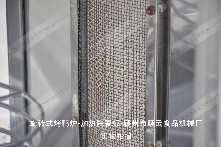 電旋轉式烤禽箱是由電子控制器組成傳動結構任意調控轉速 ;由青石蜂窩片和耐熱金屬網組成烘烤系統;烤制溫度:150℃-250℃ ;優質不銹鋼板制成;設備表面拉絲處理; 按企標制造檢驗。