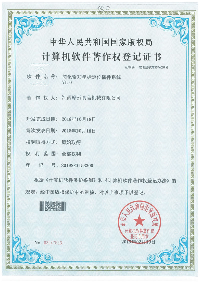 計算機軟件著作權登記證書(簡化斬刀坐標定位插件系統)