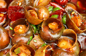 4、洗凈炒鍋,旺火燒熱,下油,倒入田螺,然后將精鹽用清水攪勻,淋入鍋內炒勻,加蓋約3 分鐘,放豆豉、蒜、紫蘇茸透炒一次,再加蓋約3分鐘,再炒,直至透熟。
