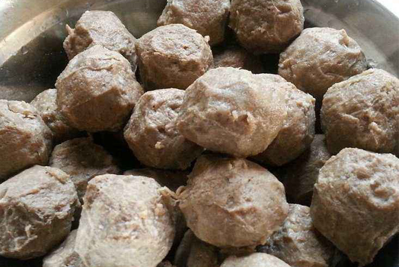 因為選用新鮮的牛腿肉作料,去筋后切成塊,放在大砧板上,用特制的方形錘刀兩把(重量3公斤左右),上下不停地用力把牛腿肉槌成肉漿,加入少量雪粉、精鹽、上等魚露和味精,繼續再槌15分鐘,隨后用大缽盛裝,加入方魚末、白肉粒和味精,拌勻,用手使勁攪撻,至肉漿粘手不掉下為止,然后用手捻肉漿,握住拳頭控制從大拇指和食指成環狀中擠出丸,用羹匙掏下放到溫水盆里,再用慢火煮丸約8分鐘,撈起牛肉丸。食時用原湯和牛肉丸下鍋煮至初沸(煮時水不能太沸,否則牛肉丸不爽滑),家里自己制作可以使用這個方法。