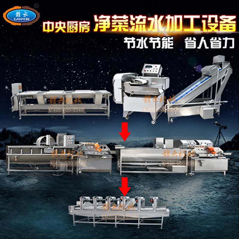 贛云掌握中央廚房凈菜設(shè)備核心技術(shù),本套設(shè)備由分選輸送設(shè)備、數(shù)字多元化切配設(shè)備、提升機(jī)設(shè)備、渦流臭氧清洗去農(nóng)藥殘留設(shè)備、高頻振動機(jī)、渦流清洗機(jī)、風(fēng)干機(jī)等組合而成。