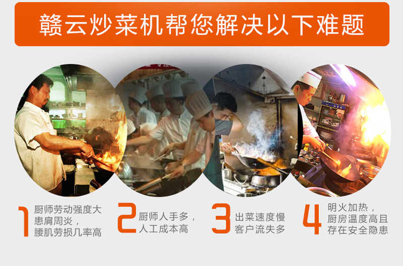 贛云炒菜機(jī),全自動翻炒,不必人工翻攪,在炒菜期間不會有飛濺,給人輕松,安全的感覺。減輕工作人員勞動強(qiáng)度,減少傷病同時(shí),提高工作效率。