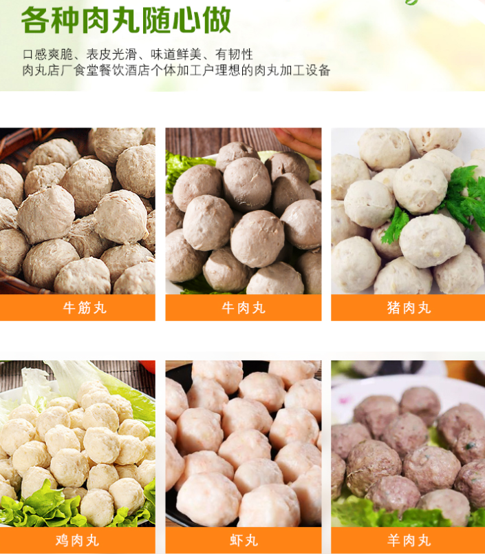 肉丸機的的工作原理是由電機轉動通過鏈條帶動絞龍旋轉后產生的壓力通過模具的大小,擠壓成型,并且機器設備可以做不同的肉丸,可以說是一款多用途的商用設備,做出的肉丸每個重量誤差也不會很大,機器是可以做各類肉丸,例:魚丸,牛肉丸,蝦丸,牛肉丸,羊肉丸,豬肉丸,雞肉丸等等。