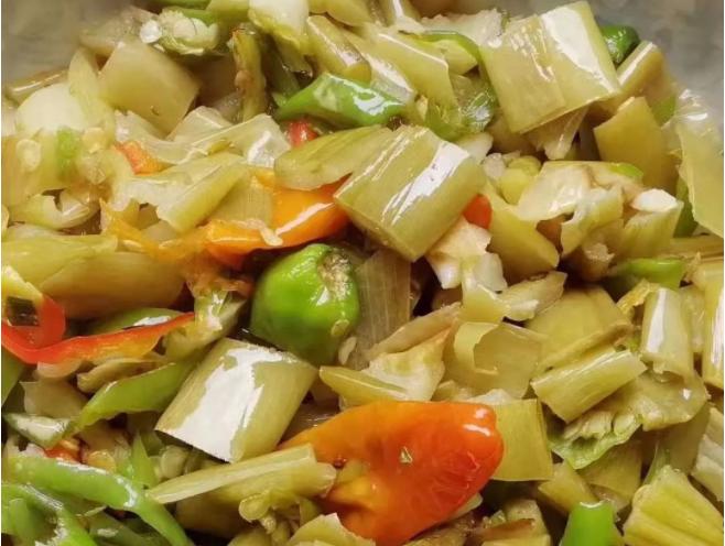 第一種就是撕皮后將芋梗切成1至3厘米,然后根據個人的喜好口味添加,蒜、辣椒等配料翻炒,這樣做出來的美食是很適合下飯。