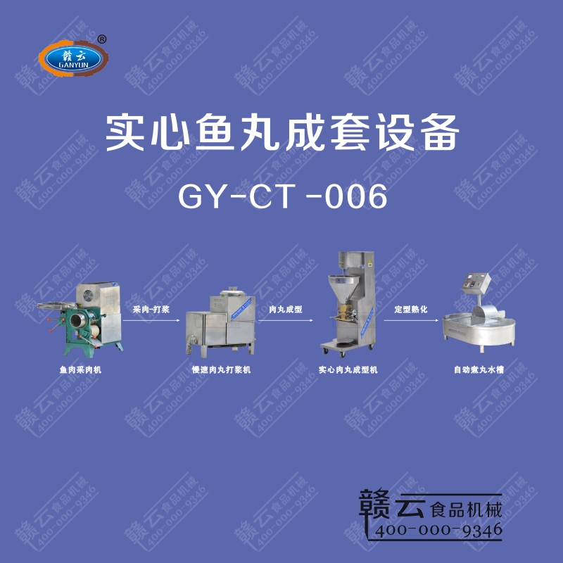 本套設備由:300型全不銹鋼魚肉采肉機、200型自動魚糜精濾機、36型全封閉慢速肉丸打漿機、300型盤式菜餡機、第二代肉丸包心機和自動煮丸水槽六臺設備組合而成。本套設備除了可以生產包心魚丸,還可生產實心魚丸,增加一臺強力絞肉機和高速打漿機亦可生產包心豬肉丸和撒尿牛丸。